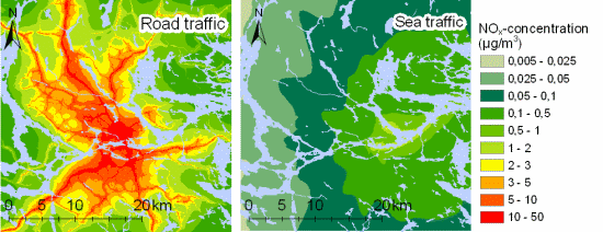 | Model calculated annual mean concentrations of NOx from road traffic emissions and shipping in the Stockholm area. |