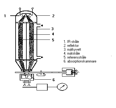 | Mätningarna av kolmonoxid (CO) baseras på kolmonoxidens absorption av infrarött ljus. Luften sugs med hjälp av en pump kontinuerligt genom en mätkyvett som genomlyses med infrarött ljus. Ljuset som passerar kyvetten absorberas på grund av CO-molekylernas förmåga att absorbera vissa våglängder. En fotodetektor mäter hur mycket ljus - av den våglängd som är specifik för CO - som absorberas i kyvetten. Ljusminskningen omvandlas till en elektrisk signal. Med icke-dispersiv IR-teknik (NDIR), mäts ljusabsorptionen inom en smal del av IR-spektrat. Uppbyggnaden av en IR-analysator med två strålgångar, en referens- och en mätkyvett visas i figuren nedan. |